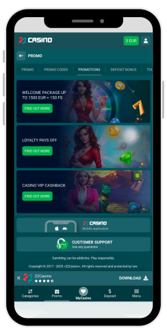 Pour visiter 22casino, vous devez avoir au moins 18, comme l’exige la loi en États-Unis d'Amérique et les conditions de 22casino