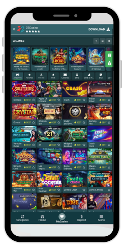 Le catalogue comprend plus de 6,000 jeux différents de 22Casino. La présentation est très pratique, avec des filtres disponibles par collections et fournisseurs. Parmi les collections, les joueurs peuvent trouver : 22Choices, Popular, Roulette, Jackpot Game, Baccarat, Keno, Buy Bonus, Cascade, Book of Slots, Crash, Hot, New, Poker, Blackjack, 3D Slots, Drops & Wins, Bingo, Megaways, Classic Slots, Cluster, et Hold and Win. Il est également possible d'ajouter des jeux aux favoris et de consulter les jeux récents.