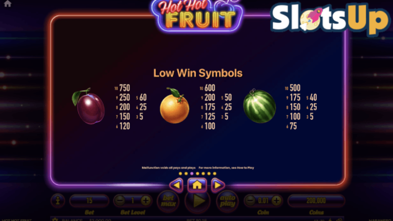 Si vous obtenez au moins trois symboles identiques sur une ligne de paiement, vous remportez un gain. J'ai préparé un tableau des gains pour Hot Hot Fruit ci-dessous.