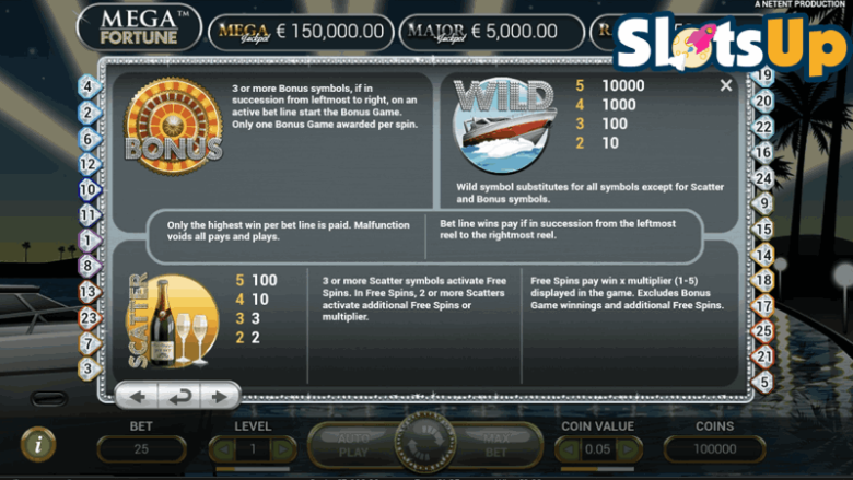 Mega Fortune est un jeu qui a fait des millionnaires depuis 2008, date de sa sortie. Le plus gros gain jamais réalisé sur cette machine à sous en ligne avec jackpot a été de 17,8 millions d'euros, en janvier 2013. Même si Mega Fortune est l'une des machines à sous les plus anciennes, beaucoup l'adorent encore. La machine à sous se déroule dans un décor de Monte Carlo avec des yachts luxueux et de magnifiques palmiers.