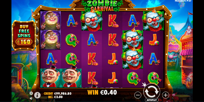 La machine à sous Zombie Carnival de Pragmatic Play est un jeu consacré au thème des morts-vivants (zombies). Elle invite les parieurs à visiter une fête foraine. Ils y rencontreront des personnages extraordinaires et auront la chance de gagner un prix généreux. Le jeu de casino en ligne possède une grille 6×4 avec 4 096 lignes de paiement. Il a été lancé le 30 mai 2022.